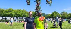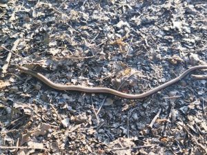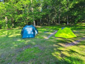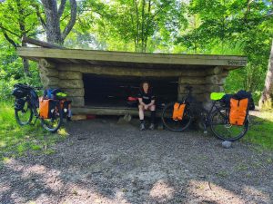 Nach einer weiteren kleinen Pause haben wir einen Platz am Wasser gefunden und geschaut ob man da baden kann. Das ging leider nicht, aber wir sind auf einen Steg gegangen, wo Kinder gerade Krebse gefangen haben und haben uns Wasser geschaut. Danach haben wir uns noch ein bisschen in die Sonne gesetzt. Nachdem wir wieder losgefahren sind, habe ich gesehen das die eine Hälfte vom Halter von Dörtes Hinterer Tasche abgebrochen war. Nach kurzem basteln und umändern der Aufhängung konnte es weiter gehen. Hielt erstmal provisorisch. Nicht nur bei mir gehen Sachen kaputt. Nach kurzer Fahrt über manche anspruchsvolle bergige Passagen kamen wir bei einem Shelter an, das nicht weit von der Straße entfernt war. Direkt daran gelegen war ein kleiner Fahrradkurs, wo Wellen und kleine Sprünge drin waren. Da ist ein Vater gerade noch mit seinen Kindern rumgefahren. Wir haben noch entspannt geschnackt und einen Kakao getrunken. Und wir haben heute Mal in weiser Voraussicht früh unsere Zelte aufgebaut, weil wir ja inzwischen diese komischen Insekten kennen. Irgendeine Art von denen kommt ja immer in der Dämmerung raus. Wir sind noch eine Runde spazieren gegangen, wo wir am Waldrand auch eine kleine Schlange entdeckt haben und dann ging der allabendliche Angriff auch wieder los. Es waren dieses Mal wieder Tausende Minimücken. Wir konnten gerade noch in unsere Zelte flüchten. Ich habe noch von innen unterm Außenzelt richtige schwärme von denen gesehen. Nachdem ich ca. 15 von den getötet hatte, die in meinem Innenzelt waren, konnte ich auch schlafen.