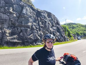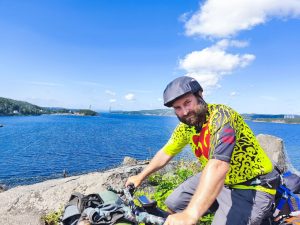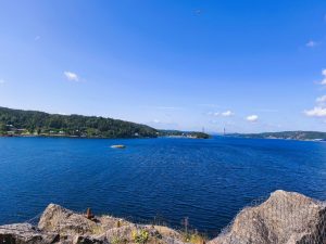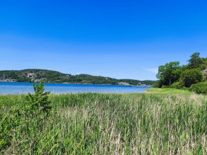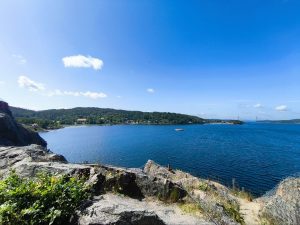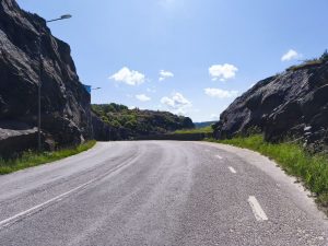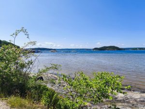 Heute mussten wir von unserem Campingplatz bei Uddevalla tatsächlich wieder wegfahren. War eine schöne Zeit hier, aber es ist auch immer schön weiter zu fahren. Vorm losfahren habe ich nochmal versucht Dörtes Fahrradmantel hinzubekommen. Seit ihrer Panne ist der irgendwie am eiern. Also nicht die Felge, sondern der Mantel scheint irgendwie verzogen zu sein. Nach langem versuchen und einsetzen eines weiteren Schlauches, war es zumindest so halbwegs wieder in Ordnung. Sie war schon mit packen fertig und ich war heute wirklich konfus und habe ständig Dinge hin und her getragen und meine Taschen 100 Mal wieder auf gemacht, aber es war auch alles durcheinander und irgendwie fühlte ich mich auch gestresst. Als wir gegen Viertel vor 11 wieder auf der Straße waren lief es irgendwie gut. Der himmel sah morgens noch grau aus, war aber inzwischen wieder komplett wolkenfrei. Die Etappe war wunderschön. Wir fuhren in bergiger Umgebung am Meer entlang, oder zumindest an dem Arm, der vom Meer aus in Inland ging. Überall waren kleine Inseln. Ich finde diese Archipel Gegenden mega spannend. Warum weiß ich selber nicht. Dazu wurde man immer Mal wieder mit traumhaften Aussichten belohnt. Ab und zu gab es auch Straßenbuchten, wo wir anhalten und Fotos machen oder Riegel essen und was trinken konnten.
