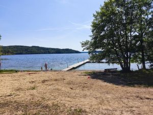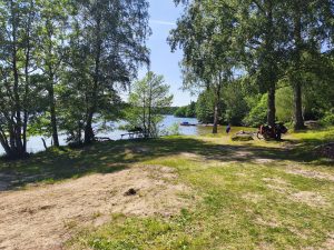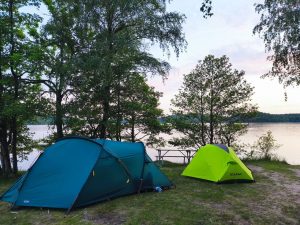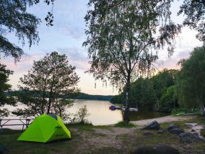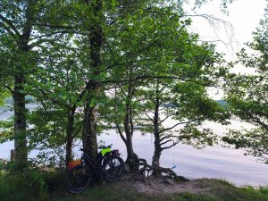 Das führte im weiteren Verlauf dazu das Dörte immer öfter schieben musste, weil die Steigungen einfach zu stark waren. Teilweise habe ich mein Fahrrad oben am Berg abgestellt und bin ihr entgegen gegangen, damit wir gemeinsam ihr Fahrrad schieben können. Wir sind dann gegen Mittag am Badesee angekommen und haben nur noch gechillt und unser Curry gegessen. Ich habe irgendwie wieder mehr Lust und ruhe zu malen. Leider war es nach einer Weile zu kalt und windig. Wenn man draußen ist, ist es oft nicht einfach mit malen, aber bei dem schönen Wetter bringt es Spaß. Wir sind dann noch einmal in den See gesprungen aber dann war es irgendwie schon zu kühl zum Baden. Es war sehr lange noch Betrieb am See und wir überlegten schon wo wir die Zelte aufbauen können. Es gab keinen versteckten Platz und so als Deutscher ist es schon ein komisches Gefühl an einem Badesee mitten in einer bewohnten Gegend zu zelten. Aber es ist ja nicht verboten. Achja. Ganz wichtig! Eine schwarze Katze kam uns im Laufe des Tages noch ein paar mal zu Besuch und wollte gestreichelt werden. Gegen 22:30 haben wir dann unsere Zelte aufgebaut und uns bald hingelegt weil wieder irgendwelche penetranten stech Viecher rauskamen. Kaum im Zelt hingelegt kamen nochmal ne Menge schreiende Kinder, die rumtobten und auf dem Steg rumrannten, der echt laut war. Aber so ist das halt wenn man an einem Badesee Zeltet. Ich war so müde das ich direkt nachdem die schreienden Kinder weg waren eingeschlafen bin.