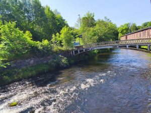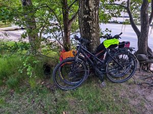 Nach der Nacht in Schräglage bauten wir alles ab und Frühstückten erstmal. Selbst morgens kamen schon diese blöden Minimücken an um einen zu nerven. Ich habe morgens noch versucht über meine Rechtsschutz Versicherung einen Anwalt zu erreichen, weil ich Klarheit wegen meiner Fahrradteile haben wollte. Dieses blöde Thema beschäftigt mich mehr als mir lieb ist und ich will das so schnell es geht aus der Welt schaffen. Leider war es gar nicht so einfach da jemanden zu erreichen. Mit einer Kanzlei hatte ich telefoniert, aber die Anwältin war leider im Gespräch und wollte mich zurückrufen. Die blöden Mücken bewegten mich dann aber dazu den Rest schnell zusammenzupacken um schnell wegzukommen. Heute haben wir geplant zu einem Badeplatz zu fahren. Der ist nicht weit weg und wir planten früh anzukommen um noch entspannt zu chillen und baden zu können. Das Wetter war mega. Nach 10km hielten wir das erste Mal bei einem Supermarkt an um auf Toilette zu gehen und ein Getränk zu holen. Echt schön aus dem Stress der Großstadt zu sein. Nachdem wir ausgetrunken und ein paar Kekse gegessen haben, fuhren wir weiter. Die Umgebung wurde merklich bergiger und es gab immer mehr Passagen die so steil waren das Dörte schieben musste. 10km vor unserem Ziel sind wir nochmal an einem Supermarkt angehalten um Essen und Getränke für den Abend zu holen. Wir wollten ein rotes Curry mit Reis machen. Vor dem Supermarkt angekommen bemerkten wir schon eine Menge Kinder auf Elektrorollern und Fahrrädern. Die standen die ganze Zeit vorm laden und haben sich da aufgeregt unterhalten. Wir beschlossen das wir unsere Fahrräder lieber nicht mit den allein lassen wollten. Dörte wartete also draußen und ich ging in den laden. Im Laden haben sie sich lautstark mit einem alten Mann gestritten. Die standen da mit ihren komischen rollern. Komische Situation. Ich kaufte weiter ein und ging zur Kasse. Später erzählte Dörte mir das der alte man wohl einen von denen ruppig am Arm festgehalten und vom Roller gezogen hatte. Egal. Wir packten die Sachen auf die Fahrräder, was die Bikes natürlich auf Grund des vielen Wassers mehrere Kilos schwerer machte. Dabei hat ein interessierter alter Mann noch über unsere Fahrräder gestaunt und fand mega cool was wir machen und das wir mit zelten unterwegs waren.