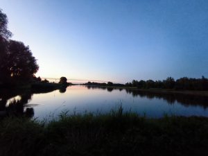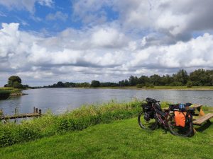 Heute hab ich echt lange geschlafen. Ein Blick aufs Handy zeigte 11:30. Also erst Mal raus. Meine Powerbank hat die ganze Nacht in der Tenne (Wohnzimmer) geladen und jetzt wollt ich mein Handy nochmal anstöpseln. Das Wetter war schön wieder sehr grau und es wirkte als würde es sich noch ein bisschen halten. Also Zelt noch im trockenen, bei sogar Recht trockenem Boden einpacken. Noch schnell 2 Brötchen mit Tomatenmark und Salami gefrühstückt und gegen 12 saß ich dann aufm gepackten Bike. Inzwischen war es ganz schön zugezogen. Beim losfahren dann die ersten Tropfen und bis zwolle bin ich dann 4 mal extrem nass geworden. Es gab dieses Mal auch keine Brücken zum Drunterstellen, aber ich habe festgestellt das große Bäume zur Not auch gehen. Wie auch immer. Ich war jedenfalls Klitschnass als ich in zwolle ankam. Das Wetter wurde aber ein bisschen freundlicher. Also holte ich mir erstmal ne Limo und setzte mich in Park. Jacky hatte auch unterwegs angerufen und jetzt telefonierten wir noch ein bisschen. Ich habe mich dann entschlossen heute nicht mehr so weit zu fahren, weil ich echt keinen Bock mehr hatte und suchte mir einen Campingplatz etwa in 12km Entfernung. Dort angekommen, sah ich, das ich einen Platz direkt auf einer landzunge mit eigenem badestrandstückchen und Bank-Tisch Kombination. Den Abend habe ich an dem Tisch gesessen und gemalt und am Handy gedaddelt. Echt edylisch. Außer mir waren nur ein paar angelnde jugendliche aus Mainz hier, aber die campten ein ganzes Stück entfernt. Hier früh anzukommen und keine Strecke machen war genau die richtige Idee. Den restlichen Abend blieb das Wetter trocken und ab und zu konnte ich sogar mal die Sonne sehen.
