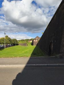 Wir sind dann weiter in ein niedliches Café gefahren, dass Dörte schon mittags rausgesucht hatte. Das lag in der Innenstadt von Belfort. Zu der man erstmal durch ein Burgtor in einem will einer mittelalterlichen Befestigungsanlage fahren musste. Davor war sogar ein leerer Burggraben.