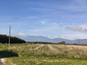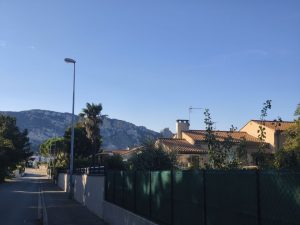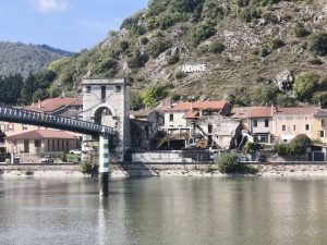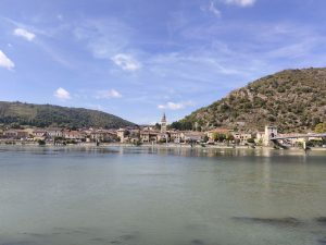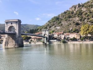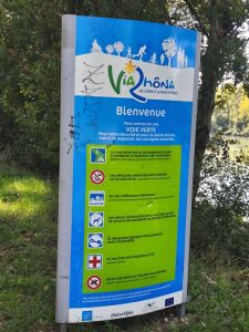 Nach einer ganzen Weile habe ich dann den Radweg gefunden der wirklich schön war. Er führte auch teilweise durch schöne Waldgegenden endlang an der Rhone. Im Hintergrund die ganze Zeit die großen Berge, die in verschiedenen blautönen am Horizont erschienen. Irgendwann bin ich dann zu einem intermarche um Mittagessen zu kaufen. Es gab wieder Baguettes um weiter den Aufschnitt wegzufuttern. Danach wollte ich zum Radwanderweg zurück. Das gestaltete sich aber nicht so einfach, weil ich zufällig genau da wo ich zum Supermarkt vom Radweg abgefahren bin, über eine Brücke fahren musste. Ich suchte also auf der falschen Kanalseite nach dem Fahrradweg. Nach elendigem rumgurken und suchen mit Hunger bin ich dann einige km zurückgefahren zur Brücke. Auf der anderen Seite ging es dann endlich wieder auf dem Radweg weiter.