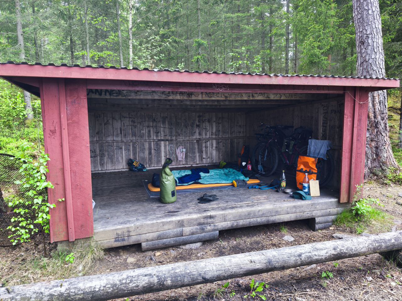 (21.05.2025 – Tag 8) Heute gab es nicht so viel zu berichten. Als ich morgens zusammengepackt hatte, kam ein Pärchen, was den Abend zuvor schon lange am See gesessen hatte. Es stellte sich raus das sie aus dem Wendland kommen. Lustig. Ich hab mit den gefrühstückt und sogar noch 2 Waffeln abgestaubt. Nachdem ich losgefahren bin, hab ich erstmal ein Bauwerk im wald gefunden. Da war aber nichts besonderes zu entdecken. Ich bin an mein Ziel gefahren was ich geplant hatte. Die Gegend hier ist zunehmend hügeligen, aber nicht wirklich anstrengend. Växjö war jetzt nicht sehr aufregend und außerdem regnete es die ganze Zeit. Zwar nur Nieselregen, aber ich war dann auch nicht mehr motiviert groß weiterzuführen. Ich suchte mir also ein shelter im Wald, was Wegmäßig nochmal ein Abenteuer war. Da kochte ich dann noch, malte, chillte und verbrachte den Nachmittag.