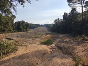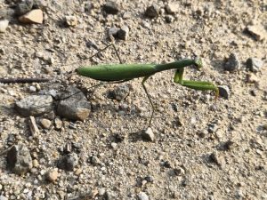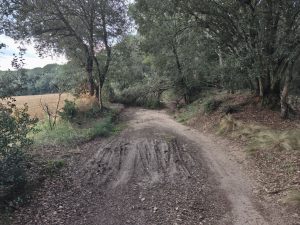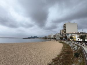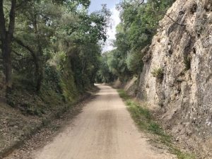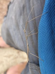 anstrengende und bergige Gegend. Überall dieser orange Sand und Schotter das lustige ist, das hier in Spanien die Wege schlechter, aber die Frequenz an Schildern, die auf die Velo 8 verweisen höher geworden ist. Auch wenn ich mich immer wieder Frage, ob die das ernst meinen, solche Hardcore Downhill singletrails als Veloroute auszuschildern. In einer etwas größeren Stadt habe ich mich dann an einem Touristen-Info Häuschen auf eine in Regenbogen farbende Bank gesetzt und Mittag gegessen. Dort war auch eine Toilette. Als ich nochmal auf Toilette gegangen war und weiter fahren wollte, stand eine Menschentraube mein Fahrrad. Alles Menschen mit Mountainbikes und es war sogar ein mountbike Tandem dabei. Die haben mich gefragt ob ich spanisch spreche und ich habe ihnen auf spanisch gesagt das ich ein bisschen Spanisch spreche. Darauf hin wurde ich dann von 3 Leuten gleichzeitig auf spanisch befragt. Die waren irgendwie so aufgeregt, das sie sich immer wieder selber unterbrochen haben. Dadurch habe ich natürlich nicht ein Wort verstanden… Eine von den hat dann auf Englisch gewechselt. Die kommen alle aus Barcelona und machen hier das Wochenende Kurzurlaub. Ich habe gleich meine Chance gewittert und gesagt das die Schlafsituation ja immer ein bisschen schwierig ist und die hat mir dann erzählt das sie auch bei warm showers ist, aber da nicht aktiv. Trotzdem hat sie mir ihre Nummer gegeben und gesagt ich soll mich einfach melden, wenn ich auf der Ecke bin. Sie würde mir ein Zimmer Freiräumen. Mega. Jetzt wo ich es am meisten brauche und der Typ der mir zuerst ein Bett angeboten hat sich nicht mehr meldet geht eine neue Tür auf. Mega. Nachdem wir Nummern getauscht und uns verabschiedet haben ging es weiter. Durch einen richtig coolen dichten Wald. Hier habe ich so ein Ast-tierchen gefunden. Es ist einfach auf mich runtergefallen und ist dann ganz aufgeregt auf meinem Trikot rumgelaufen. Als ich es knipsen wollte, hat es sich ausgestreckt und so getan als wenn es ein Ast ist. Ich wollte ein Video von dem machen, aber immer als ich mit meinem Handy ankam war es wieder ein Ast, der sich nicht bewegt hat. Am Ende habe ich es aber trotzdem noch geschafft, indem ich das Handy etwas weiter weg gehalten habe. Am Ende wollte ich es auf den Boden setzen aber es hat sich sehr festgehalten. Mitnehmen wollte den den kleinen Ast aber auch nicht und das führte dazu das ich ihn etwas unsanft abgeschüttelt habe. Das tat mir noch voll leid, weil er dann auf den Boden gefallen ist. Ich hoffe er hat sich nicht wehgetan. Als ich weiterfuhr hab ich noch mitten auf dem Weg eine Gottesanbeterin entdeckt. Die sind immer cool. Um die Velo 8 abzukürzen, weil die einen sehr komischen langen Schlenker gemacht hat, habe ich dann mein Navi mit der Navigation beauftragt. Es hat mich wieder durch die völlige Pampa geschickt. Ich hatte die Option „schmale Pfade erlauben“ in Frankreich wieder eingestellt. Hier in Spanien nicht so eine gute Idee, wie sich gezeigt hat. Ich habe es dann umgestellt und eine ganze Weile gebraucht, bis ich wieder aus dieser felsigen einöde rausgefunden habe. Ich war völlig fertig und hatte auch wieder viel zu wenig getrunken. Da ich eh im nirgendwo war, überlebte ich schon wo ich meine Hänge-Matte aufhängen könnte um wildzucampen. Ich überlegte auch irgendwo nach einem Platz im Garten zu fragen, aber die Häuser hatten hier entweder hohe undurchsichtige Zäune oder Mauern oder Stacheldraht, oder mehrere kleffende Hunde. Also wenig einladend. Irgendwann kam ich dann zu einem Platz wo campervans stehen durften. Mitten in der Stadt. Mir war es schon fast so egal, das ich dort einfach mein Zelt hingestellt hätte, aber an dem Tag war genau dort eine Manga und Cosplay Veranstaltung wo auf einer großen Bühne gerade die besten Kostüme gekührt wurden. Die nächste Option war ein Campingplatz der nochmal 15km weiter im wald gelegen war. Ich habe also durchgezogen bis zum Campingplatz und hab gehofft das er noch auf hat. Ich kam scheinbar von der falschen Seite und die Tore waren mit dicken Ketten verschlossen und es waren keine Menschen zu sehen. Als ich drumrum fuhr habe ich aber ein Lokal gesehen, wo gerade Leute Gesellschaftsspiele gespielt haben. Ich habe die Frau am Tresen mit meinen Bröckchen spanisch gefragt, ob sie einen Platz für mich frei hat. Die Antwort habe ich nicht richtig verstanden. Zum Glück konnte sie ein bisschen Englisch. Sie sagte das sie das gerade lernt und ich sagte ihr das ich Versuche spanisch zu lernen. Das fand sie mega cool und sie hat dann sehr langsam und deutlich auf spanisch alles weitere mit mir geklärt. Ich war mega stolz das ich alles verstanden habe, auch wenn mir nicht auf alles direkt die richtige Antwort einfiel. Das hat mich auch wieder mega motiviert weiter mit spanisch zu machen. Die Frau war sowieso voll nett und ich konnte mich auf einen Platz stellen, wo sogar ein bisschen rasen war.