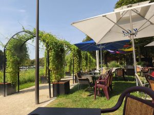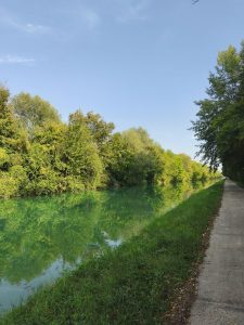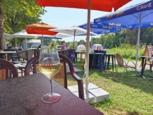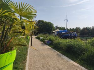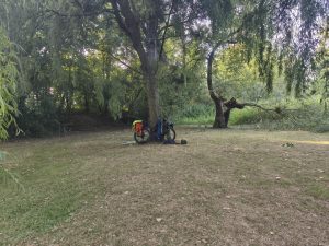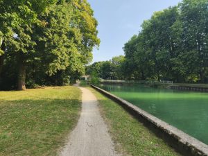 Nach dem Aufstehen versuchte ich erstmal ein bisschen die Sachen zu trocknen, die letzte Nacht nass geworden sind. Ich hab langsam meinen Kram zusammen gepackt, aber machte mir auch keinen Stress. Es war ein schöner Morgen und meine Nachbarin in Ihrem Caddy war auch schon wach. Claudia heißt sie. Wir quatschen und sie hat Kaffee gemacht. Voll lieb. Das war das erste Mal, das ich in Frankreich Kaffee mit Hafermilch getrunken habe. Ich habe nebenbei weiter meinen Kram zusammen gepackt und mir Müsli gemacht. Claudia war auch in Marokko und zeigte mir Bilder wie sie da untergekommen ist und hat mir von ihrer Reise erzählt. Echt schön ist es da. Dann haben wir allgemein noch geschnackt über reisen und arbeiten und so. Am Ende hab ich sogar noch ein halbes Baguette geschenkt bekommen. Ich wusste gar nicht, das man Brötchen bestellen konnte. Naja. Hätte ich wahrscheinlich eh nicht gemacht. Dadurch das Claudia den Tag noch hier blieb, war ich der einzige, der packen musste und wir haben echt ganz entspannt gemacht. Ich glaube ich bin so gegen 12 los gekommen. Das war schon Mal ein echt schöner und entspannter Morgen. Als ich losfuhr, ging es erstmal querfeldein. Ich wollte heute zu einer Stadt, von der ich gehört hatte das sie richtig schön sein soll. Außerdem liegt sie in meiner Richtung. Die Stadt heißt Châlons en Champagne. Mit Fachwerkhäusern und voll gemütlich. Das Navi schickte mich an erstmal über schotter-feldwege und dann wollte sie mich auf eine Nationalstraße schicken. N24 hieß die. Ich weiß das noch so genau weil ich an der ankam und direkt beschloss einen langen Umweg in Kauf zu nehmen um sie zu vermeiden. Außerdem habe ich später noch nachgesehen, ob man überhaupt mit dem Fahrrad darauf fahren darf. Natürlich erst nachdem ich 5km darauf gefahren war. Aber zuerst konnte ich es noch vermeiden indem ich zwischen Feldern entlang gefahren bin. Wäre ich direkt drauf gefahren, wäre ich sicher 15km darauf gefahren. Die war 2-Spurig in beide Richtungen mit Leitplanke in der Mitte und Standstreifen. Gefühlt wie auf einer Autobahn zu fahren. Entsprechend fuhren die Autofahrer auch und da Autofahrer oft die Tendenz haben zu denken ihnen gehört die Straße allein, wurde natürlich auch gehupt und mit knapp 100km/h geschnitten. Is ja nur ein Menschenleben. Und da der Mensch auf einem Fahrrad sitzt ist er ja eigentlich auch gar kein Mensch. Penner. Naja. Sind ja nicht alle so. Viele haben auch Rücksicht genommen. Aber solche Spinner zeichnen dann halt ein Bild im Kopf was hängen bleibt. Naja. Nach diesem Straßenterror (es war übrigens erlaubt da zu fahren) fuhr ich eine Ausfahrt runter, die auch wirkte wie eine Autobahnausfahrt. Dann kam ich in den Ort. Erstmal zu einem großen Supermarkt. Dort gab es sogar Lakritz. Hier habe ich dann alles mögliche gekauft was ich so braucht. Hauptsächlich Essen. Danach steuerte ich direkt einen Park an einem Kanal an, wo es eine „cosy bar“ gab. Vielleicht bekomme ich hier endlich meinen Wein. Der Name klingt ja schon Mal gut. Als ich im Park ankam war ich begeistert. Es waren überall im Schatten gelegene Sitzmöglichkeiten und die cosy bar, machte ihrem Namen auch alle ehre. Es waren Sonnensegel in verschiedenen Farben gespannt, überall hingen Lampions und es gab ein Sammelsurium aus Stühlen. Darunter auch Liegestühle und die Leute saßen hier und tranken Limo, Wein und Bier. Ich setzte ich erstmal auf eine Bank und aß mein Baguette, was ich mir noch mit Kram belegte. Erstmal den Straßen Schock verarbeiten und ankommen. Nachdem ich aufgegessen hatte, suchte ich mir einen Platz von dem ich auf den Kanal schauen konnte und auf die dort ankernden Boote. Ich bestellte mir einen Weißwein und genoss es einfach im Schatten zu sitzen und das Treiben zu beobachten. Nebenbei lief so französische klimpermusik und es war eine super relaxte Stimmung. Genau so hatte ich mir meinen ersten Wein in der Champagne vorgestellt. Ich hab bestimmt eine Stunde an meinem Glas getrunken und mir dann noch einen rosé bestellt. Am liebsten wäre ich einfach hier geblieben, aber das ging ja nicht. Nach dem 2. Dachte ich über noch ein Glas nach. Ich hatte immer noch meinen Vorsatz, mir keinen Stress mehr wegen Campingplatz zu machen und das gelang mir gerade echt gut. Nach dem 2. Glas überlegte ich, ob ich nochmal in die Stadt fahre, um ein paar Fotos zu machen. Sie soll ja echt schön sein, aber ich glaube es machte in dem Moment wieder klick und ein weiterer Stresspunkt löste sich auf. Ich hinterfragte, wozu ich die Stadt sehen will und warum ich den Umweg für die Fotos machen würde. Ziemlich schnell wurde mir klar, das ich es sicher nicht für mich mache. Mir sind doch die Fachwerkhäuser egal. Ich brauche das nicht extra ansehen. Klar ist es schön wenn man es sieht und da vorbeikommt. Und natürlich kann man dann auch Fotos davon machen. Aber ich werde nicht extra einen Umweg dafür fahren. Ich mache nur noch, wozu ich Lust habe. Ich brauche nichts beweisen, oder zeigen wie toll mein Urlaub ist. Das ist alles nur für mich. Ich fand Reims gar nicht so schön und ich fand Lille auch gar nicht so schön. Mir sind grüne Ecken und Ruheoasen viel wichtiger als prunkvolle bauten. Ich bin lieber in der Natur und finde es viel schöner besondere Bäume zu finden oder Gegenden, die ich aufregend finde. Also dachte ich mir, dass ich ohne Umwege weiter fahren wollte, um noch ein bisschen aus der Stadt raus zu fahren, wo ich mir irgendwo einen Platz zum Schlafen suchen wollte. Mir war schon klar daß es wohl auf wildcampen hinauslaufen würde. Trotzdem rief ich noch einen 30km entfernten Campingplatz an. Der hatte sogar bis 20:00 offen. Naturcamping oder so. Ich wollte fragen, ob ich auch nach 20:00 kommen könnte. Es war schon nach 18:00 und selbst wenn ich wollte hätte ich 20:00 nicht mehr geschafft. Es ging ein Mann ans Telefon der mir sagte das es auf gar keinen Fall möglich ist. Ich bedankte mich nur und sagte das ich mir dann eine andere 