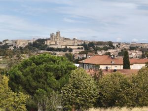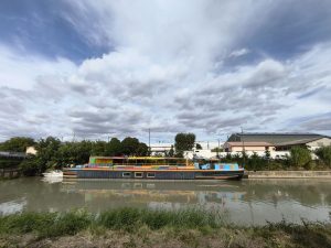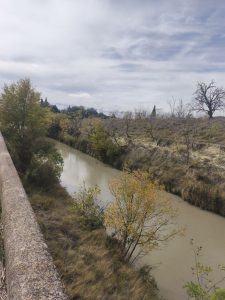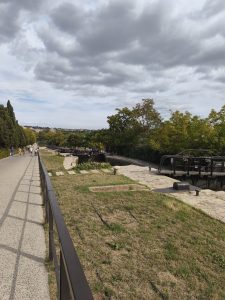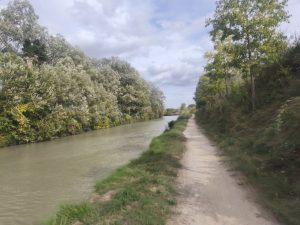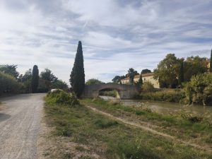 Es war in der Stadt Béziers. Die wohl eine große Attraktion war. Es war schon eindrucksvoll mit den großen Bergen am Horizont. Ich hab nachgesehen und es waren die Berge Vom Nationalpark Haut Languedoc. Nachdem ich aus der Stadt wieder raus war, fuhr ich den Kanal weiter. Und irgendwann kam wie immer der Moment, wo ich anhielt und mir einen Überblick über meine Schlafsituation machte. Ich war in einer Reichen Gegend und Bonzen in hummer und Porsche Cayennes fuhren hier rum. Auf der anderen Seite vom Kanal waren Villen mit Palmen im Garten zu sehen. Nicht die beste Ecke im nach nem Platz im Garten zu fragen. Die reichsten Menschen haben immer die größte Angst davor etwas von ihrem Platz mit dem Pöbel zu teilen und außerdem haben die oft Angst, das jemand ihnen ihren Reichtum wegnehmen könnte. Es waren auch weit und breit keine Campingplätze die offen hatten zu finden. Es gab also die Möglichkeit wildzucampen und mich mit meiner hängematte irgendwo zwischen Bäume zu hängen, oder weiterfahren und was passendes fürs Zelt zu finden. Weit und breit nix. Dann kam ich an einem Hausboot vorbei. Es sah aus, als wenn hier entspannte Menschen leben. Das Boot war bunt angemalt und auch der Bereich drumherum wirkte friedlich und gemütlich. Leider war es am anderen ufer. Nach einer weile kam aber eine Brücke und ich wagte den Versuch Mal hinzufahren und zu schauen wer da so unterwegs war. Nachdem ich auf der andern Uferseite über ein kleines weinfeld gefahren war, ging es etwas durchs Dickicht und Ich erreichte nach einiger Zeit das boot. Es stand eine Badewanne mit Kerzen davor und auf dem boot wehten Klamotten zum Trocknen auf einer Leine. Daneben waren bunt angemalte Stühle und ein Tisch. Komisches Gefühl. Ich war quasi ungefragt in deren Wohnzimmer eingedrungen. Als ich am Ufer stand und rief, tat sich nichts. Leider niemand zu Hause. Ich drehte also um und fuhr wieder zum Kanal. Während dessen merkte ich schon, wie mein Hinterreifen sich immer schwammiger anfühlte. Er verlor wieder Luft. Ich stand auf einem Schotterplatz auf der unbewohnten Seite des Kanals und musste wohl oder übel wieder meinen reifen flicken. Kein Schlafplatz in Sicht, im nirgendwo und ich sah langsam die Sonne untergehen. Scheiße.