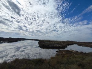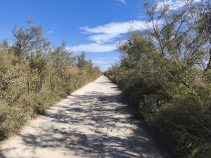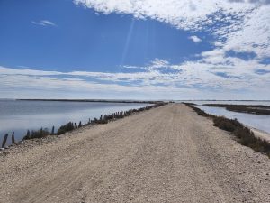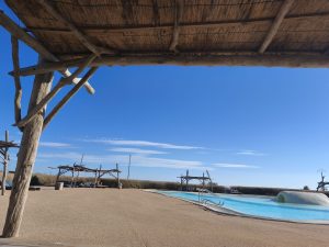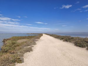 Als wir an der Stelle angekommen waren, die wir auf unserem Plan schon gesehen haben, wollten wir noch was zusammen essen und dann unsere unterschiedlichen Wege fahren. Es gab kein Schatten also hängten wir unsere Handtücher bei einem kleinen Häuschen über ein Geländer und verkrochen uns im Halbschatten. Auf dem Rückweg bin ich dann wege gefahren, die eigentlich wie ein Steg waren. Eine Straße aus Schotter und Sand und rechts und links Meer. Ich kam auch an noch mehr Flamingos vorbei und die Schlaglöcher wurden immer größer. Es kamen mir sogar Autos entgegen die scheinbar noch mehr mit den Schlaglöchern zu tun hatten als ich, weil das umfahren sich natürlich ein bisschen komplizierter gestaltet. Das letzte Stück musste ich dann an der Straße zurückfahren, die wir auch gekommen sind. Auf dem Campingplatz bin ich dann ohne Umwege mit meinem Fahrrad und der vollen Fahrradtasche an den Pool gefahren und erstmal ins Wasser gesprungen. Das war geil. Ab jetzt war chillen angesagt. Ich lag nur faul am Pool Rum und habe ein bisschen geträumt und ein bisschen gemalt.
