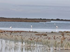 Danach haben wir uns dann ein bisschen Infomaterial zum Nationalpark geholt. Es gab verschiedene routen. Girmi wollte gern eine große Tour machen, weil es ohne Gepäck ja einfach ist. Ich wollte flamingos sehen und eine kleine Tour machen und dann den restlichen Tag relaxen. Wir hatten uns am ende für eine Tour entschieden, bei der ich an einer Stelle zurück kann und wo Girmi dann weiter fahren kann wenn er Lust hat. Guter Kompromiss. Es ging dann erstmal zu dem kleinen sparmarkt. Ein paar Snacks einkaufen und ein bisschen Kram für Sonntag. Dann ging es erstmal einen Straße endlang und dann noch mehr Straße. Also wir durch eine Nebenstraße abkürzen wollten wurden wir von den Anwohnern angemerckert und zurückgepfiffen. Es war scheinbar Privatgelände. Das sahen wir dann auch beim zurückfahren. Da stand ein kleines unscheinbares Schild, das halb in einen Busch eingewachsen war. Nachdem wir zurück auf der Straße waren, ging es dann irgendwann eine Sandstraße entlang. Und es stand ein Schild das uns zeigte das wir jetzt also scheinbar im Nationalpark sind. Den hatte ich mir aber anders vorgestellt. Es war eine reine Küstenlandschaft. Sand und plattes Land überall. Irgendwann sahen wir dann auch die flamingos. Das war ganz cool. Aber außer dieser Flamingos waren kaum Tiere unterwegs. Es gab kaum Schatten und es war windig. Ich weis das es für viele Menschen toll ist und das die diese Landschaft sehr mögen, aber ich bin nicht so der Küstenmensch.