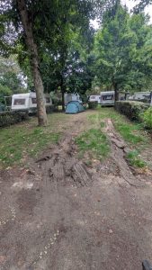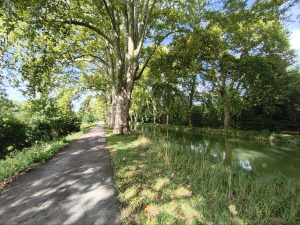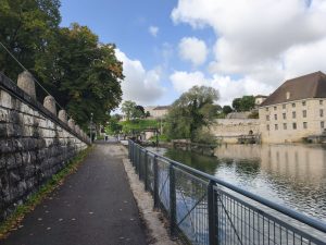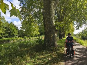Wir sind Recht früh wach geworden und auch ziemlich direkt aufgestanden. Nach dem Frühstück haben wir wieder angefangen die Sachen an unsere Bikes gebaut. Während dessen kamen die Deutschen mit ihrem Camper vorgefahren und haben uns die powerbank gebracht. Als sie fragten ob wir noch irgendwas brauchen, hat Dörte sich noch kurz deren Föhn geliehen um ihr Inlett ein bisschen trocken zu Föhnen. Ich habe beim rumlaufen an dem Sanitär-Haus noch eine mega eckelige Spinne gesehen. Die hatte einen riesen Körper und Haare an den Beinen. Eine der größten die ich in meinem Leben gesehen habe, aber Dörte war trotzdem nicht so begeistert als ich sie ihr zeigen wollte. Naja. Als wir fertig waren, haben wir erstmal meine kleine Bluetooth Box auf volle Pulle aufgedreht und Ärzte gehört. Es waren über 75km vor uns und das war ein guter Antrieb. Die ganze Zeit schön flache Strecke und am Kanal entlang. Immer um die 20km/h. Bis die Box dann leer war. Dann suchten wir uns einen Supermarkt um eine Kleinigkeit zu essen. Nebenbei lud die Box an meiner kleinen powerbank um wieder gute Stimmung zu machen. Lange hielten wir aber nicht. Aber die Box ließen wir in Ruhe laden bis die kleine powerbank leer war. Dann gab es Deichkind. Die Gegend war echt schön und das Wetter war wieder die ganze Zeit kurz vor dem großen Regen, der aber zum Glück wieder nicht über uns herrunterkam. Bis auf ein paar Tropfen blieben wir verschont. Mit lauter Musik aus meiner Rahmentasche ging es dann weiter bis wir nach etwas über 75km in Dijon ankamen. Es ging durch etwas zwielichtig wirkende randbezirke. Viel Industrie, verlassene Gebäude mit OSB Platten vor den Fenstern und Leute die unter Brücken abhingen. Danach dann irgendwann durch einen etwas schöneren Bereich und in einen Park. Es ist manchmal lustig, wie diese Stadtcampingplätze angelegt sind. Man fährt zwischen Hochhäusern und Graffiti durch, dann über eine Brücke und ist plötzlich in einem grünen Park. Dann kommt irgendwann der Campingplatz. Dieser Campingplatz war aber ein ganz besonderer, wie sich später rausstellte. Er entpuppte sich zu einem der lieblosesten und hässlichsten, die ich bisher gesehen habe. Es gab keinen Platz mehr auf der Campingwiese deshalb nahmen wir einen Wohnmobilplatz mit Strom für 18€ die Nacht und weil ich ja Mal wieder chillen wollte, buchte ich gleich 2 Nächte. Als wir zu unserem Platz kamen, sahen wir das es quasi keinen rasen gab. Die Parzelle bestand nur aus Matsch. Das Wohnmobil was Scheinbar vor uns da stand hatte tiefe Reifenspuren hinterlassen in denen Wasser stand und alles war am vorderen Ende um gepflügt, weil da wohl jemand versuchte zu rangieren, oder vielleicht im Matsch stecken geblieben war. Wir suchten uns also einen Fleck am hinteren Ende und bauten das Zelt auf. Zum Glück hatte Dörte ja noch eine 2. Wasserfeste Picknickdecke bestellt, die wir im Zelt ausbreiten konnten um die Feuchtigkeit ein bisschen abzuhalten. Nachdem wir das Zelt aufgebaut hatten, fuhr ich los zur Amazon Box, wo die Decke drin lag und Dörte fuhr einkaufen. Die Fahrt zur Box in der innenstadt war der Horror. Ich war müde und die Führung der fahrradwege, falls mal welche da waren, war so unübersichtlich das ich oft Kreuz und quer zwischen Autos und Fußgängern rumfuhr. Es war dazu noch Feierabendverkehr. Ich dachte mir nur „was für eine Grottenhässliche Stadt“, aber vielleicht konnte sie mich ja morgen vom Gegenteil überzeugen. Als ich endlich bei der Box ankam und wieder nach Hause fahren konnte war ich mit den Nerven schon durch. Es ist eh immer eine Umstellung, wenn man die ganze Zeit in der Natur ist und dann in eine große Stadt kommt, aber wenn die so hässlich und unübersichtlich ist und ich dazu noch total müde bin, geht das kaum noch zu unterbieten vom Spaßfaktor. Ich habe eh auf der Reise für mich festgestellt das ich nicht mehr in einer Großstadt leben will. Das Wendland ist vielleicht einen Tick zu abgeschieden, aber Hamburg ist mir auch zu groß. Ich habe mich bisher in kleineren Städten wie Kiel, Freiburg oder sogar noch Augsburg immer am wohlsten gefühlt. Auch eine tolle Erkenntnis, weil ich in meinem Leben ja noch nicht in vielen Städten gelebt habe. Eigentlich war ich immer nur im Dunstkreis von Hamburg und irgendwie habe ich mir immer mal gewünscht wo anders zu sein. Es hat sich nur nie ergeben. Naja. Ich war also zurück auf dem Campingplatz und als Dörte zurück war sahen wir das heute in Pizza foodtruck 2 Plätze neben unserem Zelt stand. Der hatte sogar einen großen Ofen mit Kohle eingebaut. Wir beschlossen das Essen am nächsten Tag zu essen und heute Pizza zu essen. Wir verträumten also alles und holten uns eine Pizza. Nach der Pizza haben wir noch ein bisschen gechillt und ich habe ein bisschen gemalt. Nachdem wir dann duschen gegangen sind, sind wir ins Zelt gegangen und haben geschlafen.