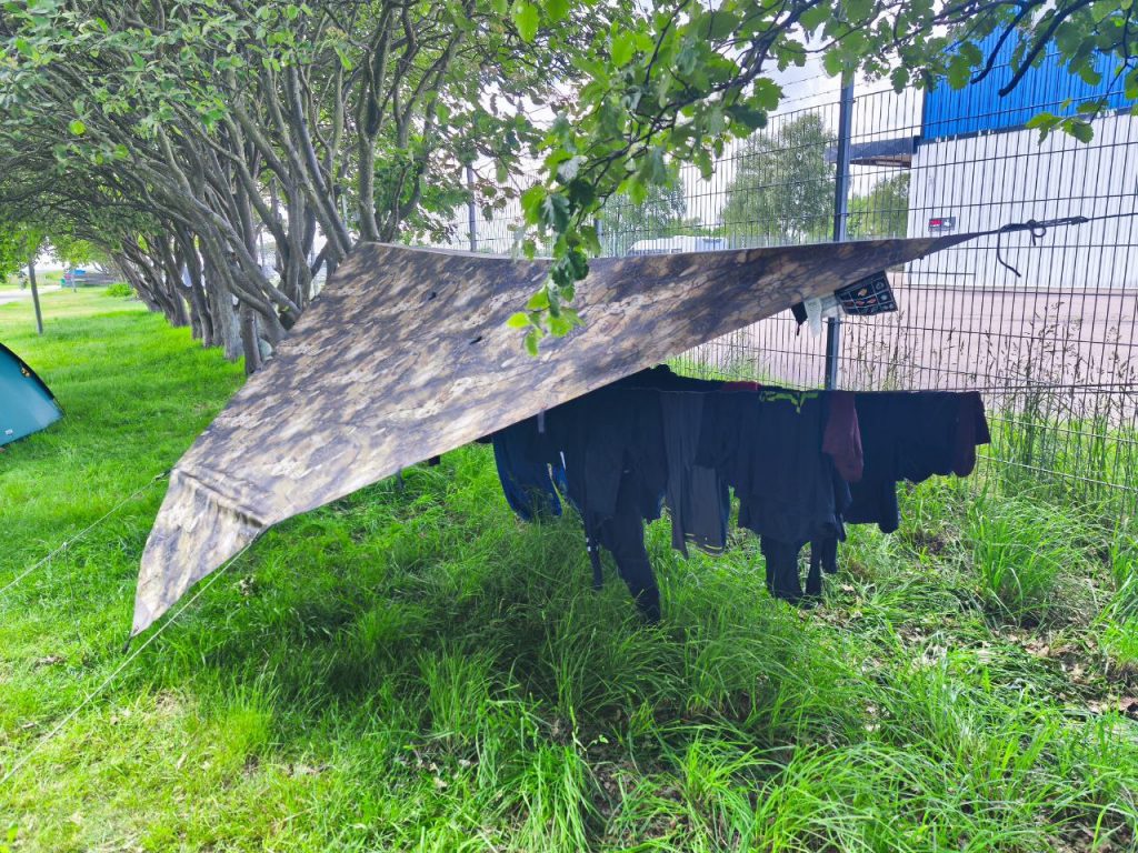 Nach dem Aufstehen haben wir gefrühstückt und einen Plan entworfen. Ich wollte allein mit meinem kaputten Bike zur Werkstatt fahren, wo ich ja gestern mit dem Mechaniker abgesprochen hatte, das er mein Fahrrad zwischen schiebt. Dörte und Sören wollten Wäsche waschen, aufhängen und später mal zum Einkaufen fahren. Da das Wetter sehr wechselhaft sein soll, habe ich mein Tarp aufgebaut und zwei Wäscheleinen darunter gespannt. Dann kann die Wäsche sogar bei Regen im Wind trocknen.