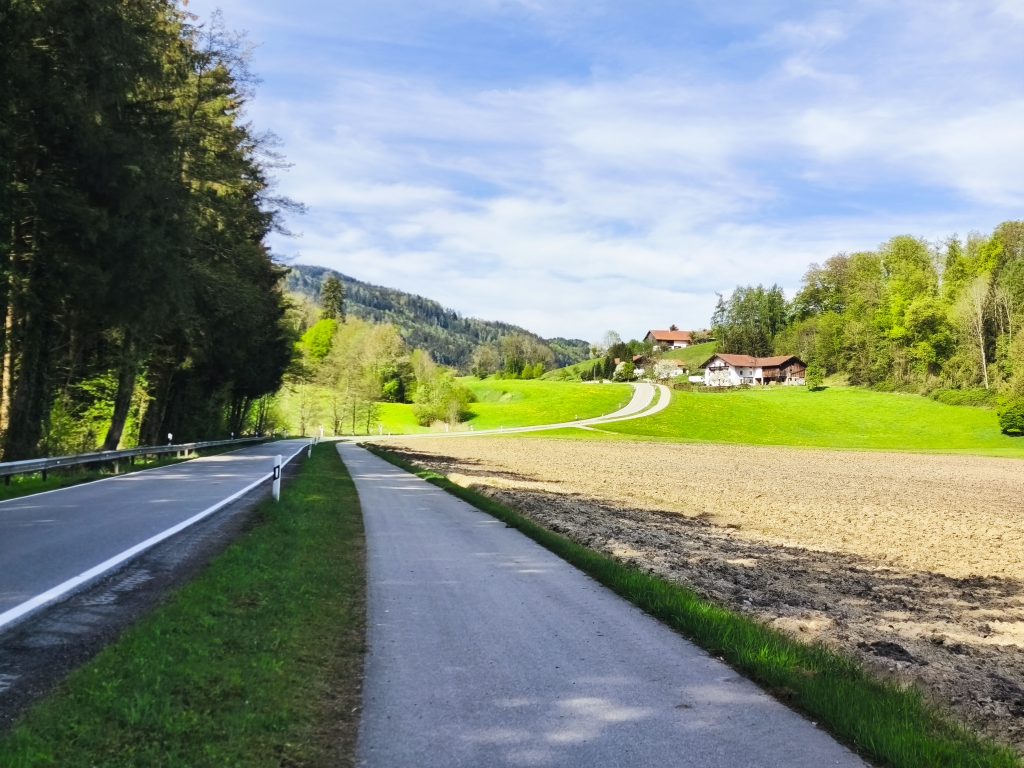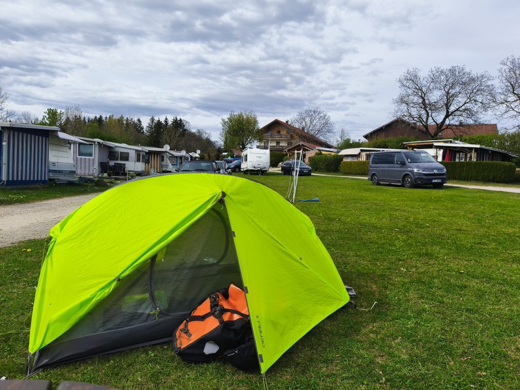 Ich habe am Campingplatz in Salzburg recht früh alles zusammengepackt und bin gegen 9:00 losgeworden. Heute waren ca. 40km geplant. Dabei hat sich gezeigt das 40km sehr stark davon abhängen, wo man sich bewegt. Irgendwie kommt es mir total schwer vor abzuschätzen wie weit man an einem Tag fahren kann. Langsam glaube ich das 40km die untere Grenze sind. Dann, wenn es sehr bergig ist. Das war der Großteil Heute nicht. Ich habe die Grenze nach Deutschland passiert ohne es zu merken. Hab es erst vermutet als ein Bäcker mit „Echten Bayrischen Backwaren“ geworben hat. Naja. Ich war gegen 13:00 am Cmpingplatz angekommen. Hatte erst noch überlegt zum Chiemsee urchzuziehen, weil es noch voll früh war, aber als ich nach Campingplätzen geschaut habe und die durchweg über 30€ für ein kleines Zelt wollen, bin ich hier geblieben. Außerdem hatte ich noch nicht mal gefrühstückt, zu wenig getrunken und die Sonne fing an unerträglich zu werden. Also erstmal Frühstück. Dabei habe ich bemerkt das es quasi nicht eine Stelle auf dem ganze Platz gibt, wo Schatten ist. Das spricht wiedermal dafür, mein Gepäck um ein Tarp zu erweitern. Also erstmal duschen und versuchen zu malen. Keine Chance. Es war so unerträglich heiß das ich mich in mein Zelt verkrochen habe und da am Tablet Comic gelesen habe. Zwischendurch habe ich noch besuch von einer süßen schwarzen Katze bekommen. Das war bisher mein heutiges Highlight. Jetzt sind Wolken aufgezogen und ich hab mich wieder aus dem Zelt getraut. Das war echt eine krasse Hitze und unerträgliche Sonne. Zum Glück habe ich so ein cooles Zelt. Heute Abend gönne ich mir vielleicht mal was im Lokal. Schließlich ist Ostern.