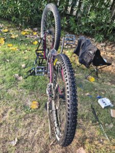 Nachdem ich in der Nacht ein paar Mal von Regen geweckt wurde, bin ich morgens noch im Zelt geblieben, bis der Schauer vorbei ist. Ich hab ein bisschen den warmen Schlafsack genossen und gemalt. Ich hatte ja keine Eile, weil ich mir überlegt hatte noch eine Nacht zu bleiben. wollte Als es aufgehört hat zu regnen, bin ich dann aufgestanden und habe meinen Kram gepackt. Dann ging es wieder in die Stadt. Heute hatte ich ja geplant noch im anderen großen fahrradladen nach Fahrradmänteln zu schauen. Aber erstmal musste ich feststellen, das die Rezeption Mittagspause gemacht hat. Es war nämlich schon nach 12 als ich los kam. Dann muss ich den eben später sagen das ich noch einen Tag bleibe. In der Stadt musste ich auch feststellen das der Laden noch in der Mittagspause war. So spät war ich nämlich auch noch nicht. Naja. Die Franzosen nehmen die mittagspause immer sehr ernst. Da sollten sich die Deutschen Mal eine Scheibe von abschneiden. In der Zeit wo ich auf den Laden wartete bin ich dann nochmal richtig ins Zentrum der Stadt gefahren. Ich hatte ja einen weiteren Plan, den ich erledigen wollte. Ich hatte Jacky ja versprochen, ihr aus jedem Land eine Karte zu schreiben. Aus Frankreich hatte ich ihr auch schon eine geschickt, so ca. Vor einer woche. Nur leider habe ich vergessen ihre Adresse drauf zu schreiben. Also musste ich jetzt eine neue holen. Irgendwie war es aber gar nicht so einfach eine Karte zu finden die nicht als Geburtstagskarte oder sonst wie Grußkartenmäßig aufgemacht war. Sone komische tourikarte von der Stadt ist auch nicht mein stil. Außerdem soll sie ja Frankreich repräsentieren und nicht eine stadt. Alles gar nicht so einfach. Erstmal ging es aber zum Supermarkt um was zu futtern zu kaufen. Schließlich hatte ich heute noch kein Frühstück gehabt. Danach klapperte ich alle „Papeterien“ ab, die ich finden konnte. Durch Zufall kam ich bei einem kleinen Künstlerverkaufsladennvorbei, wo ich eine tolle Karte gefunden hab, die so wie diese französischen Plakate aus den 80ern aufgemacht war. Das war ja schon mal gut. Als ich gerade wieder losfahren wollte, sah ich einen kunstbedarf laden. Da wollte ich auch noch kurz schauen ob die Karten verkaufen. Und ich hatte Glück. Ich habe dort genau die Karte nochmal bekommen, die ich Jacky ohne Adresse geschickt hatte. Jetzt noch schnell zur Post und Briefmarken holen. Danach ging es dann wieder zum fahrradladen. Der hatte tatsächlich eine menge reifen. Sogar von Maxxis. Leider hauptsächlich 29″ ich brauchte 27,5″ selbst die Verkäufer konnten nichts passendes finden. Also hatte ich die Wahl zwischen keinen kaufen und ohne Profil durch die Pyrenäen und wer weiß wie lange ich dann noch mit dem alten Ding rumfahren würde, oder einen Reifen der eine kleine Nummer breiter ist, und dickeres Profil hat. Wer mich kennt, weiß wofür ich mich entschieden habe. Jetzt fahre ich also vorn mit 27,5″x2,35 und hinten mit 27,5×2,4. Sehr cool. Ich war mir erst nicht sicher, aber als ich den Mantel gekauft hatte, war ich mir sehr sicher, das es die richtige Entscheidung war. Bei dem ganzen überlegen und abwägen, habe ich leider wieder vergessen Reservebremsbacken zu kaufen. Ich hoffe das wird nicht mein nächstes Problem. Reservespeichen zu kaufen hatte ich ja auch so lange vor mir hergeschoben, bis es zu spät war… Naja. Ich werde mir in Spanien mal einen Bikeshop suchen müssen. Als ich alles hatte was ich brauchte ging es wieder zum Campingplatz. Kurz bescheid sagen das ich noch einen Tag länger bleibe und dann chillen. Und dann hab ich mich irgendwann noch dazu aufgerafft den Reifen umzubauen. Natürlich mit Selbstreparierendem Schlauch drin. Keinen Bock das diese nervige tausch- und flickerei weitergeht. Sonst dreh ich noch durch. Wenn das jetzt nicht klappt, bleibt nur noch auf tubeless umzurüsten. Jetzt habe ich zumindest sowas wie semitubeless. Nachdem ich dann noch schnell was gegessen habe wurde es schon wieder spät und langsam dunkel. Ein anstrengender, aber erfolgreicher Tag. Ich bin zufrieden und morgen kann es dann mit gutem Gewissen in die Berge gehen.