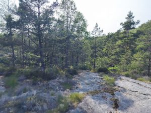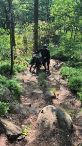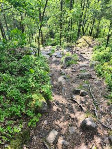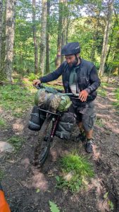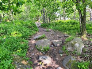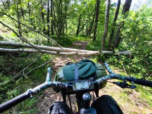 Zum Ende unserer Etappe, wurde es nochmal richtig Bergig. Dörte hat streckenweise schon geschoben und dann sind wir einen kleinen weg zum shelter reingefahren. Plötzlich wollte komoot uns über ein Privatgelände mit Zaun und Kameras schicken. Da haben wir dann umgeplant und ich habe mal die Koordinaten in mein Navi eingegeben. Wir mussten einen immer kleiner werdenen Weg entlang, wo dann noch eine Birke umgekippt über dem Weg lag. Also Taschen ab und drüber heben. Bei allen drei Fahrrädern. Danach wurde es auch nicht besser und ich würde den Weg als anspruchsvollen Wanderweg beschreiben. Man musste über große Felsen und verblockte Wege. Am Ende wurde es so steil das wir die Taschen abbauen und Taschen und Räder separat hoch schieben/tragen müssten.