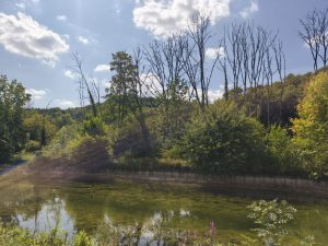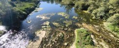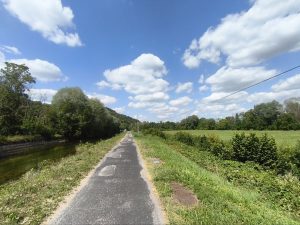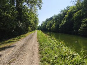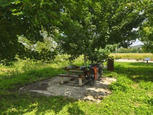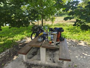 Ich bin aufgewacht und bilde mir ein das diese zwei Nächte schon etwas mit mir gemacht haben. Ich war nicht in Panik schnell alles abzubauen, sondern bin in aller Ruhe aufgewacht und habe erstmal geschaut ob es schon an der Zeit ist aufzustehen. Was soll auch schon passieren, außer das mich jemand verscheucht. Ich hatte meinen Schlaf und eigentlich war doch alles gut. In der Nacht war ich wieder mehrfach aufgewacht und habe teilweise ne Weile gebraucht um wieder einzuschlafen. Trotzdem fühlte ich mich Recht fit und beschloss aufzustehen. Der See war leer und es waren noch keine Menschen unterwegs. Es war ungefähr 7:00. Ich baute also in aller Ruhe ab und machte mir erstmal einen Kaffee. Ansonsten hatte ich nichts zum Frühstücken da, aber auch nicht so richtig hunger. Ich brauchte eine Weile und nahm mir alle Zeit die ich brauchte um mein Fahrrad zu beladen. Dann konnte es losgehen. Wieder an den Kanal. Das alte Spiel. Schotter, Berg, Schleuse, Schotter und so weiter. Es tauchten immer größere Berge am Horizont auf aber ich war ja am Kanal und brauchte eigentlich nur die kleinen Berge fahren um wieder aufs nächste Kanal-Level zu kommen. Ich fuhr genau so schnell das es nicht anstrengte. Meine Beine traten quasi von allein und ich beobachtete die Landschaft. Und natürlich die Schlaglöcher. Ab und zu hielt ich an und schaute auf der Karte wo ich lang komme und irgendwann machte ich mich auf die Suche nach einem Supermarkt um etwas zum Frühstück/Mittagessen zu kaufen. Irgendwann führte mich der Kanal dann durch eine kleine Stadt, wo ich mir einen blaubeerskyr und Müsli kaufte. Dazu noch einen Liter Limo und anderen Kram. Auf bonschi verzichtete ich. Irgendwie hatte ich schon Lust auf was süßes, aber mit Gummibärchen Kram war ich übersättigt und Schokokekse oder so gingen ja wegen der Hitze nicht. Statt dessen noch einen Apfel und ein paar gelbe Kiwis zum gleich essen. Alles in die Taschen und wieder an den Kanal. Ich merkte das ich echt extrem überladen war. Das ganze Paranoia Wasser, dann noch die 1,5l Schweppes, die ich nicht trinken mag, weil sie einfach immer viel zu warm ist und dann noch der liter Limo die ich gerade gekauft hatte. Ich hatte locker 8kg Flüssigkeit in top, zu meinem eh schon fett bepackten Fahrrad. Jetzt hieß es also Augen offen halten für eine gute Stelle zum essen und um die Mittagssonne ein bisschen auszusitzen. Es dauerte eine ganze weile. Ich denke ich bin sicher so 1-2 Stunden weiter gefahren, bis ich auf der anderen Uferseite eine große Wiese mit einem Tisch unter einem großen Baum sah. Also rüber und erstmal hinsetzen. In meinem Stil, erstmal den ganzen Tisch Vollmüllen, das ich selber kaum Platz habe zu sitzen und erstmal was essen. Eine 1,5l Flasche Wasser habe ich auch noch ausgemustert und die 1l Limo habe ich auch ausgetrunken. Dann noch den 500g skyr aufgegessen mit Müsli und Apfel. Also quasi etwas über 3kg weniger. Lustig ist, das das Gewicht inzwischen nicht mehr mir zu schaffen macht, weil die Kraft inzwischen nicht mehr das Problem ist. Ich mache mir nur Sorgen ums Fahrrad. Naja. Dann habe ich noch Blog geschrieben und sogar noch ein bisschen gemalt. Inzwischen werde meine Tage immer entspannter und ich genieße das sehr. Ich habe mich die letzten 2 Tage echt wegen nichts mehr gestresst. Die Schlafsituation hat sich komplett aufgelöst, weil ich einfach mal auf Campingplätze scheiße und dadurch endzerrt sich auch mein ganzer Tag. Mir doch egal ob ich 1 Stunde oder 4h Mittagspause mache. Ich werde schon abends irgendwo mein Zelt hinschmeißen.