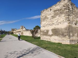 Wir sind heute aufgewacht und es gab in der Nacht keine besonderen Vorkommnisse. Außer das ein paar von uns meinten, kurz Stimmen von 2 Leuten gehört zu haben. Selbst wenn da welche waren, haben sie zumindest nichts gemacht. An mir ist das auch komplett vorbeigegangen. Wir haben uns fertig gemacht, gefrühstückt und waren Recht schnell fertig. Da ich mit meinem Zelt auf einer Art Holzveranda gestanden habe, gab es auch nichts mit Feuchtigkeit zu regeln. Echt entspannt. Wir waren Recht schnell fertig und wieder auf der Straße. Es ging direkt wieder zum Kanal und wir sind gut vorangekommen. Wie es aussah, standen auch heute wieder mindestens 60km auf der Uhr. Und es passierte heute etwas. Nach unserer Planung trennten sich heute die wege. Luwin und Sophie, die nach Barcelona unterwegs waren wollten so schnell es ging weiter in die Richtung und überlegten sogar eine Strecke mit der Bahn zu fahren. Da wurde mir mal wieder klar in was für einer geilen Situation ich bin. Es ist halt ein anderes reisen, wenn man zurück nach Hause und zur Arbeit muss. Dann hat man, besonders bei so einer langen Strecke nicht so die Flexibilität zu sagen das man irgendwo einfach mal bleibt, oder sogar Umwege macht. Ich hatte sehr viel Zeit und konnte frei entscheiden was ich mache. Darum entschied ich mich mit Girmi weiterzufahren. Er war zwar Richtung Marseille unterwegs, was nicht meine Richtung ist, aber er wollte in einen großen Nationalpark. Die Camargue. Und dieser Nationalpark lag schon grob in meiner Richtung. Darum hatte ich Lust auf Natur und außerdem könnte es passieren, dort Flamingos zu begegnen. Ich nahm also diesen kleinen Umweg in kauf und plante diese Richtung. Den Tag konnten wir allerdings noch alle zusammen fahren und das war ein schöner Gedanke. Wir sind also erstmal bis Avignon gefahren. Dort wollten Luwin und Sophie ein Bisschen Sightseeing machen. Da das Sightseeing dieses mal bedeutete mit dem Fahrrad durch die Stadt zu fahren, war ich sofort dabei. Auch wenn ich mich gefreut hätte, wenn die eine Kirche oder Burg besichtigen würden, damit ich ein bisschen im Park chillen kann. Dafür war aber keine Zeit. Als wir durch die Stadt ging es dann durch kleine Gassen und an einer Stelle fuhren wir dann umgekehrt durch eine Einbahnstraße. An einer Stelle sprangen Kinder hinter einem Auto auf die Straße, was dazu führte das das eine von einem Tandem umgefahren wurde. Es ist aber nichts passiert. Dann ging es weiter und mir gefiel diese alte Stadt inmitten von Burgmauern so gut das ich natürlich anhielt und ein Foto machte. Als ich dann weiter den anderen folgen wollte kamen jede Menge Autos entgegen, so das ich an der Seite halten musste um die vorbeizulassen. Dadurch habe ich dann den Anschluss zu den anderen verloren. Als die Straße wieder frei war, waren sie nicht mehr zu sehen. Ich dachte das sie sicher bis ans Ende der Straße gefahren sind und dort auf mich warten. Aber auch da waren sie nicht. Auf der rechten Seite kam ich auch an einer Stichstraße vorbei die übertrieben voll mit Menschen war. Ich dachte das die Wahrscheinlichkeit das sie da reingefahren sind, und dann noch mit dem unbeweglichen Tandem gegen Null geht. Aber 100% sicher war ich mit auch nicht. Also fuhr ich zu dieser Stelle und wartete dort. Ich setzte mir ein Limit von 15min. Und stand da um zu warten ob sie zurück kommen. Wäre in meinen Augen das einzig logische. Aber es kam niemand. Nachdem ich das Gefühl hatte das niemand mehr zurück kommt, schaute ich auf mein Handy. Nummern getauscht hatten wir die ganze Zeit noch nicht aber ich hatte ihnen zumindest meine Homepage gesagt, auf der auch ein Kontaktformular ist, was eine Email zu meinem Postfach schicken würde. Auch nichts, also war der nächste Gedanke das ich zur Fahrradstraße via Rhona fahre und auf der ersten Bank die ich sehe nochmal anhalte. Erstens musste ich da eh weiter und zweitens mussten sie da Vorbeikommen, wenn sie die Stelle nicht schon lange passiert hatten, aber dann hätte ich eh keine Chance sie wiederzufinden.