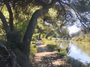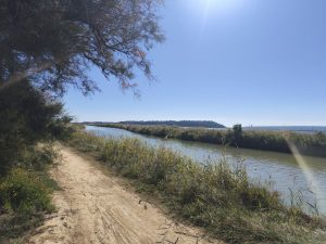 Heute bin ich wieder etwas beruhigter aufgewacht. Die Speichen scheinen zu funktionieren und es kann weiter gehen. Ich hab mir also erstmal einen Kaffee gemacht und dabei festgestellt, das ich wieder meinen Reifen flicken muss. Langsam nervt es extrem. Beim flicken und abbauen, habe ich schräg von meinem Platz eine Hängematte und einen dicken Wanderrucksack gesehen. Spannend. Da dachte ich mir ich geh Mal rüber um Mal mit dem zu schnacken wo’s hin geht. Das war gut und sehr interessant, weil Paul (übrigens auch aus Norddeutschland) auch eine richtig spannende Reise macht. Er hat gerade das Studium fertig und hat sich 9 Monate Auszeit genommen. Hätte ich das mal auch gemacht, aber das ist eine andere Geschichte. Jedenfalls ist er per Anhalter unterwegs und ist damit schon echt weit gekommen. Innerhalb von ungefähr 2 wochen bis hier, wenn ich das richtig erinnere. Das hat natürlich aber dafür ein bisschen den Nachteil, das man nicht ganz bestimmten kann wo es lang geht und aus dem Auto sieht man auch nicht so viel von der Natur. Allerdings hat man so auch immer mal ne Begleitung und was noch viel cooler ist, keine Platten reifen. Jedenfalls nicht die eigenen. Naja, er will auch nach Marokko und dort findet an einem bestimmten Datum eine Segelregatta statt. Die geht nach Südamerika und Paul will dort versuchen auf ein Schiff zu kommen. Mega spannend und ich werde es sicher ab und zu Mal bei insta verfolgen. Wir haben uns noch ein bisschen unterhalten und einen Granatapfel aus „meinem Garten“ gegessen. Dann sind wir gemeinsam zum Kanal spaziert, der direkt am Campingplatz war und er ist Richtung Stadt und ich musste genau in die andere Richtung. Da ging es gleich wieder richtig gut los und man merkt das die Velo 8 echt noch in der Entwicklung steckt. Es war Teilweise nur ein singletrail auf Sand. Der Kanal führte dann irgendwann wieder Richtung Meer und von da aus ging es wieder etwas Richtung Stadt. Es führte bis zu einem Bahnhof. Dann stand ich blöd da. Ich hatte nicht auf dem Schirm das auch die Tracks Natürlich noch in der Entwicklung stecken und so fehlte ein großes Stück (ca. 10km) von der Route einfach. Vom Bahnhof aus sah man auf dem Navi eine Luftlinie zum nächsten Punkt. Also hab ich den Punkt in mein Navi eingegeben und bin nach Navi da hin gefahren. Die Strecke war cool und surreal. Es wirkte wie eine Wüste. Alles nur Sand und so komisches Gestrüpp. Wenn ich nicht wüsste das dahinter das Meer ist, hätte ich echt gedacht das ich in einer Wüste war. Es lagen sogar verlassene Sachen Rum. Bei dem einen bin ich mir nicht ganz sicher, ob es sogar ein Stück einer Flugzeugtragfläche war.
