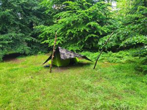 Die Nacht war extrem scheiße. Ich war mehr wach als ich geschlafen habe. Bin immer wieder aufgewacht und hörte, wie von meinem Tarp Bäche neben meinem Zelt auf den Boden Platschten. Wenigstens haben sich so die Seen auf dem Tarp entleert. Meine Angst war ja das das Wasser sich auf dem tarp sammelt und dann noch irgendwas schlimmes passiert. Zum Glück war es die Nacht im Wald Recht Windstill und alles hat gehalten. Mir ist immer etwas unwohl so ein großes „Segel“ in der Nacht allein zu lassen. Besonders, wenn es an meinem Zelt befestigt ist. Aber es ging ja nicht anders. Zumindest war alles trocken geblieben.