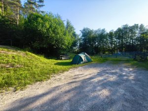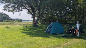 Die Nacht auf dem Parkplatz war ganz ok und der Untergrund war grader bei den meisten sheltern. Wir hatten uns den Wecker auf 6 gestellt, damit wir früh beim Campingplatz ankommen. Wenn wir schon Geld zahlen, dann wollen wir auch die ganze Zeit nutzen. Ich war total übermüdet. Aber ich habe mich trotzdem aufgerafft und wir sind früh losgefahren. Ich hatte die Hälfte von meinem stuff gar nicht vom Fahrrad abgenommen, so das nur die Futtertasche einmal für Frühstück geöffnet werden musste. Der Weg war irgendwie anstrengend, auch wenn er kurz war. Wir merkten beide unsere Beine vom Vortag und zumindest ich war extrem übermüdet. Wir kamen aber um 9 beim Campingplatz an und konnten erstmal eine Wäsche reinschmeissen und das Zelt aufbauen. Danach erstmal warm Duschen und die Wäsche auf einer improvisierten Leine aufhängen. Ich hatte einen Zaunpfahl im Gebüsch gefunden und zwischen dem und einem Baum 2 Leinen gespannt. Danach wollten wir noch einkaufen. Heute gab’s wieder Pizza und wir haben und Chips und bonschi geholt. Die 5km hin und zurück fühlten sich auch extrem anstrengend an. Als wir zurück kamen wollte ich mich erstmal ausruhen und wir haben Dörtes Picknickdecke ausgebreitet. Da haben wir dann erstmal die Chips und bonschi gegeasen. Ich habe danach noch ca. 10min. Da gelegen und wollte ein bisschen Mittagschlaf machen. Dann hab ich aber vom Wind so gefroren, das ich ins Zelt umgezogen bin. Isomatte fertig gemacht und erstmal hingelegt. Dörte hat draußen irgendwas gemacht. Ich glaube so richtig geschlafen habe ich nicht, aber wenigstens noch ein bisschen ausgeruht und die Augen zu gemacht. Nebenbei noch eine Allergietablette eingeworfen, weil mich die Pollenallergie auch stresste. Irgendwann habe ich dann Hunger bekommen und wir haben jeder 1,5 Pizzen gegessen und unsere Getränke getrunken. Später haben wir noch eine Folge Serie auf Dörtes Tablet geschaut. Mehr habe ich nicht durchgehalten. Dann bin ich relativ früh völlig erschöpft eingeschlafen.
