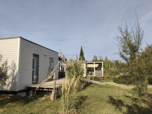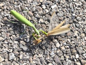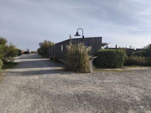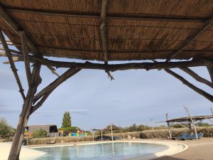 Als ich heute morgen aufgestanden bin, kam direkt der niedliche Hund wieder und wollte spielen. Es wirkte so als wenn er nur auf die ersten Menschen gewartet hat, die aufstehen und mit ihm spielen. Ich glaube der gehört zu dem Campingplatz und streunert hier so Rum. Ich habe ein bisschen stöckchen geworfen und mich dann langsam ans Frühstück gemacht. Girmi war inzwischen auch wach und wir hängen unsere nassen Sachen über den Zaun vom Swimmingpool. Als wir fast abreisebereit waren, hat er gefragt ob ich Interesse daran hätte, die Burg anzusehen die hier direkt war. Das hatte ich nicht, aber ich hab ihm gesagt das ich statt dessen gern ein bisschen chillen und auf ihn warten würde. Er ist also losgezogen und ich habe erstmal Jacky angerufen. Nach kurzer Zeit kam er zurück und meinte das er seinen eBook Reader sucht. Die Burg war wohl zu teuer und außerdem sollte die Führung über eine Stunde dauern. Er war etwas in Eile wegen dem Reader. Ich packte also schnell alles aufs Fahrrad und wir radelten da hin, wo wir uns gestern von den anderen verabschiedet haben. Zum Glück war der Reader noch da und lag im Gras. Auf Grund der braunen Hülle war er wohl niemandem aufgefallen. Der Tag war also wieder super, alles war gut und wir fuhren wieder auf der via Rhona. Die Landschaft ist irgendwie wieder langweiliger geworden. Es gab keine Berge mehr und es sah auch nicht mehr so wirklich mediterran aus. Es war mehr eine Platte Küstenlandschaft. Auf Grund des guten Weges konnten wir aber schnell Kilometer machen. Es ging die ganze Zeit nur geradeaus und am Streckenrand änderte sich auch nicht. Schildpflanzen, ein bisschen Heide und Gräser. Nach einer ganzen Weile sind wir dann am Supermarkt Ran und haben uns essen gekauft. Danach war es wieder wie bei mir als ich das letzte Mal hangry wurde. Kilometer weit keine Bank und auch nicht viel Gras am Wegestand. Außerdem super wenig Schatten. Weil wir aber irgendwann zu hungrig wurden hielten wir irgendwo, wo man zumindest ein bisschen Schatten hatte, ich packte meinen campingstuhl aus und wir aßen. Als wir weiterfuhren entdeckte Girmi auf dem Weg eine große grüne Gottesanbeterin, wie sie eine braune bei lebendigem Leib aß. Keine Ahnung warum die das machen und noch beeindruckender das es gleich zwei waren, wo man sonst ja nicht Mal eine zu sehen bekommt. Nachdem wir ein bisschen bei dem Kannibalismus zugesehen hatten, fuhren wir weiter. Die Landschaft wurde nicht schöner aber es war spürbar, das wir in der Nähe vom Meer waren. Die Luft roch danach und die Landschaft sah halt aus wie eine Küstenlandschaft. Meins ist das nicht so, aber da muss man halt auch Mal durch. Irgendwann kamen wir dann an eine Fähre. Richtig cool war, das die für Fahrräder kostenlos war. Auf der anderen Seite wirkte es irgendwie wie eine kleine miniinsel. Es gab einen kleinen Marktplatz, wie wir später rausfanden und eine Bäckerei, aber viel außer Wohnhäuser, dem Campingplatz und einem Mini Dorfkern gab es hier nicht. Der Campingplatz war allerdings super schön. Er hatte sogar einen Swimmingpool der geöffnet hatte und sehr kalt war. Wir waren heute ziemlich genau 60km gefahren. Und langsam habe ich das Gefühl das ich echt Mal wieder Lust auf eine echte Pause habe. Nicht 60km statt 80. Ich bin im Gegensatz zu den anderen nicht in Eile und ich genieße auch sehr die ruhigen Tage. Aber es hindert mich ja niemand daran, das in der nächsten Zeit wieder voll auszukosten. Ich bin ja auch froh, das ich mit den anderen mal wieder richtig im flow war und schön weit in den Süden gekommen bin und genau so war das ja auch geplant. Heute Abend haben wir dann außer Einkaufen und Couscous zum Abendbrot kochen nichts mehr gemacht. Ich bin danach dann total müde ins Bett gefallen und habe noch ein bisschen mit Jacky telefoniert.