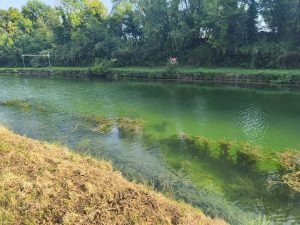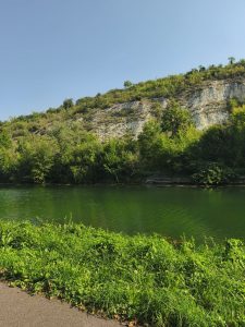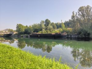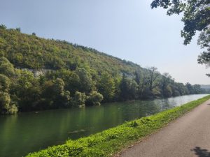 Einmal musste ich noch über einen Berg fahren um zu einem anderen Kanal zu wechseln. Von da aus ging es immer weiter am Wasser endlang. Es gab ein zugewuchertes verlassenes Haus, was aussah wie aus einer anderen Zeit und ein paar „Geisterboote“ die da am Ufer rostend und mit leichtem Pflanzenbewuchs lagen. Der Kanal war sowieso glasklar und man konnte teilweise bis auf den Boden kucken. Überall flogen Libellen und es war wunderschön grün. Einmal raschelte es im Gebüsch und plötzlich kam ein Tier vor meinem Bike über den Weg gerannt, was locker so groß war wie ein kleiner Hund und mich vom Gesicht her stark an einen Biber erinnerte. Leider hatte es keinen Biberschwanz. Ich denke also es war ein nutrier. Schade. Ich will unbedingt Mal einen Biber in freier Wildbahn sehen. Egal. Ich fuhr übrigens auf dem Paneuropa Radweg, auf den ich schon gestern durch Zufall gekommen war. Jacky hatte etwas recherchiert und mir gesagt das man an diesem Kanal bis nach Freiburg fahren kann. Und das es der Paneuropa Radweg ist. Also werden die kommenden Tage wohl von Kanal geprägt sein. Wenn es so wunderschön ist, bin ich sehr zufrieden mit dieser Strecke.