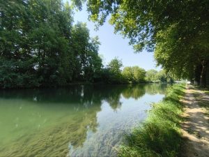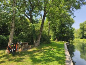 Die Nacht war so mittel. Ich bin öfter aufgewacht und hatte sogar einen Albtraum. Der hatte mit dem wildcampen zu tun. So groß ist scheinbar die Angst erwischt oder konfrontiert zu werden. Das ist aber tatsächlich das kleinere übel, wenn man Mal drüber nachdenkt was alles mit der Campingplatz alternative für ein Stress zusammenhängt. Ich habe also dann einfach versucht weiter zu schlafen. Morgens bin ich dann vom Licht der aufgehenden Sonne geweckt worden. Ich lag ja ohne Außenzelt da. Es war echt ein schöner Morgen und statt das irgendwas negatives passiert wäre, sah ich in der Entfernung, mitten an der Straße noch ein Zelt. Daneben ein campervan mit hochgeklapptem Dach. Wenn man Mal trocken drüber nachdenkt, ist wildcampen ja jetzt auch nicht wirklich ein vergehen oder so. Ich kann verstehen dass es kritisch gesehen wird, weil es natürlich auch Idioten gibt, die überall ihren Müll liegen lassen, aber wenn ich weg bin, sieht keiner das ich da war. Im Gegenteil. Ich habe schon öfter mehr Müll mitgenommen als ich selber produziert habe, weil ich es echt scheiße finde wenn die schöne Natur vollgemüllt ist und irgendwelche Plastikbecher oder Tüten rumfliegen. Ich Wette mit der Zeit ist das gar nicht mehr sowas besonderes. Aber an den Träumen sieht man ja, das das was ich an der Oberfläche denke und das was in mir passiert, noch zwei unterschiedliche Dinge sind. Ich habe dann als erstes Mal angefangen meinen Kram einzupacken und das Zelt abzubauen. Erstmal alles in die Taschen gestopft und bin umgezogen zur Straße, wo das andere Zelt stand. Da gab es eine Tisch/Bänke Kombination und ich wollte mir da erstmal einen Kaffee machen. Dort saß auch schon der Wanderer, der in seiner Hängematte geschlafen hatte. Er war schon komplett fertig und schrieb etwas in ein Büchlein. Wahrscheinlich Tagebuch. Als ich mit meinem geraffel am Tisch saß, kam auch langsam leben in den Campervan. Es war eine Familie mit 3 Kindern, die nach Südfrankreich wollten. Die waren den Vorabend 800km gefahren und das Zelt wurde vom Sohn bewohnt. Die sahen auch überhaupt kein Problem darin. War halt ne Notübernachtung. Ich machte ein bisschen Platz auf dem Tisch, damit sie auch sitzen könnten. Ich neige ja dazu meinen ganzen Kram auszubreiten, bevor ich ihn wieder einpacke. So bekomme ich einen Überblick und habe das Gefühl das ich alles sinnvoll tetris-mäßig verräumen kann. Naja. Es stellte sich raus das die Familie aus Deutschland kam und wir haben gemeinsam gefrühstückt. Ich konnte sogar wieder ein bisschen Hafermilch für den Kaffee schnorren. Der Sohn wollte alles mögliche von mir wissen und er wollte unbedingt mein GPS Navi sehen und ich sollte es anmachen, damit er sehen kann. Wie das aussieht. Der Vater war gefühlt nur etwas älter als ich und wir redeten über Frankreich und das sie Mal in Belgien gewohnt haben und deswegen die Sprache gut können. Außerdem über den Fahrrad Lebensstil und und und. Die Mutter kam schon in Badeanzug aus dem Camper und ging erstmal ins Wasser, nachdem sie mich gefragt hatte ob das Wasser sauber sei. Nachdem ich endlich alles am Fahrrad hatte und mich verabschiedet hatte, ging’s los. Erstmal zum Anleger gegenüber. Ich hatte ja vom Wanderer erfahren daß es da Trinkwasser gibt. Also habe ich erstmal alle Tanks aufgefüllt. Und mich auf den Weg gemacht. Die Temperaturen waren etwas kühler als bei den Vortragen. Das änderte aber auch nichts daran, das es quasi keinen Schatten gab und ich die ganze Zeit am Kanal auf inzwischen nicht mehr ganz so gut befestigter Strecke fahren musste. Das war schon echt mühselig. Slalom um Schlaglöcher und immer wieder von links nach rechts und andersrum, weil ich immer versuchte die besser befahrbare Seite zu finden. Die Gegend war aber voll nach meinem Geschmack.