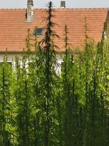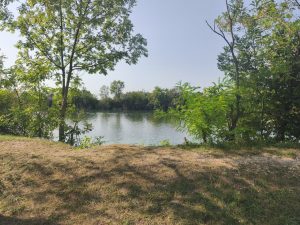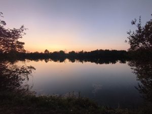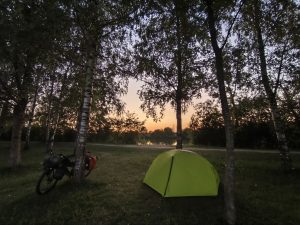 Mittagspause machte ich auch an einem schönen Ort, wo Bänke und Tische im schatten standen. Es war eine krasse ruhe. Keine Autos, kein trubel. Nur der Wind, die Vögel und ab und zu das Summen von ein paar insekten. Direkt neben der Bank waren brombeersträuche, wo die Brombeeren so reif waren, das man nur die Brotdose drunter halten musste und ein bisschen am Ast wackeln um die zu pflücken. Ich hatte noch 100g Naturjoghurt vom Frühstück über, also machte ich mir erstmal einen leckeren Nachtisch. Nach dem Mittag ging es noch ein bisschen weiter. Unter anderem an einem Hanffeld vorbei. Das hätte ich hier wirklich nicht erwartet, aber es wuchs wieder direkt am Weg. Ich hatte es schon am Geruch erkannt. Naja paar Fotos und dann weiter. Die Nachmittagssonne war wieder gut am braten und die Hitze fühlte sich auch ganz schön heftig an. Nach gar nicht so langer Zeit hatte ich keinen Bock mehr. Ich fuhr zu einem Friedhof und füllte meine Wasserreserven nochmal auf. Wer weiß wann wieder was kommt. Dann setzte ich mich auf eine Bank in den Schatten und verschaffte mir einen Überblick. Scheinbar war auf der anderen Kanalseite eine art park. In den Rezensionen las ich, das man da sogar baden kann und das es dort eine Toilette gibt. Also fuhr ich hin um mich Mal umzuschauen. Als ich ankam glaubte ich kaum was ich da sah. Es war scheinbar eine beliebte Badestelle. Es waren nicht zu viele Menschen, aber es waren Kinder im Wasser und Leute saßen im Schatten und tranken Bier. Es gab sogar ein Sanitärhäuschen mit großen Waschbecken und Toilette. Ich war mir sicher das ich meinen Platz für heute Abend gefunden hatte. Also Badehose und Handtuch raus und erstmal ins Wasser. Dann saß ich lange an einem Tisch und träumte einfach vor mich hin, schrieb Blog und kochte mir mein abendbrot. Heute gab es Tortellini mit Tomatensauce, Zucchini und einer grünen Tomate. Ich finde geil das es hier ganz oft ganz viele verschiedene Tomaten zu kaufen gibt. Nicht wie in Deutschland nur diese roten Norm-Wasserbomben oder Cocktailtomaten. Naja. Ich ging noch ein paar Mal ins Wasser. Irgendwann wurde es spät und ich überlegte wo ich am besten mein Zelt aufbauen kann. Ein Franzose kam noch zu mir und wollte wissen ob ich hier zelten will. Als ich ja sagte, schwärmte er mir noch ein bisschen von diesem Ort vor. Das die Menschen hier alle voll lieb sind und das man auch um den ganzen See einmal Rum kann. Außerdem sagte er mir, das es sogar eine Dusche mit warmen Wasser im Sanitärhäuschen gibt. Ich glaub hier hat echt niemand etwas dagegen, wenn man sich irgendwo unauffällig mit seinem Zelt hinstellt. Im Gegenteil. Als ich um den See fuhr um eine gute Stelle zu finden, wurde ich von jedem gegrüßt der mich sah. Ein Typ, der gerade Lagerfeuerholz klein machte kam mit einem abgebrochenen Stock auf mich zu. Er sah ein bisschen aus wie man sich einen Hooligan vorstellt. Er wollte aber auch nur wissen wo ich herkomme und was ich mache. Leider konnte der nur französisch und ich glaube wir haben deswegen ein bisschen aneinander vorbeigeredet. Er sagte mir aber auch nochmal das es dort hinten duschen gibt und ich fuhr weiter. Am Ende baute ich das Zelt an einer Stelle auf, die von allen Menschen so weit wie möglich entfernt war, aber direkt am Ufer gelegen war. Beim Aufbauen grüßten mich noch die vorbeilaufenden Mensch und als ich mich hinlegte, hatte ich auf keinen Fall das Gefühl, nicht willkommen zu sein. In ein bisschen Entfernung war gerade eine Party in Gange, weil heute hier Maria Himmelfahrt war und gegen 12 gab es von allen Richtungen aus Feuerwerk zu hören. Später hörte ich noch eine Frau ihren Hund rufen, der wohl interessiert an meinem Zelt war. Die Leute liefen auf dem Weg um den Kanal und keiner störte sich an meinem Zelt. Abends bekam ich dann noch ein bisschen Magenschmerzen. Keine Ahnung wovon. Vielleicht sollte ich tierische Produkte nicht mehr essen, die ich 2 Tage in der Hitze in meinen Taschen transportierte. Naja. Die Nacht war wieder sehr ruhig und ich konnte extrem viele Sterne sehen, als ich nochmal auf Toilette gegangen bin.