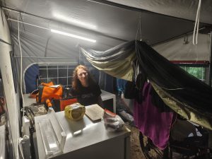 Wir haben 3 Wäscheleinen gespannt und Dörte mochte keine Lebensmittel auf die Flächen legen, also hat sie überall Müllsäcke drunter gelegt. Dann ging es zum Duschen. Geil wie man sich über eine warme Dusche freuen kann. Der Campingplatz war schon eher alt und abgenutzt. Aber soweit ist alles sauber. Und es gab sogar einen Pool. Nach dem Duschen haben wir Gemüse für Chinanudeln gechnibbelt.