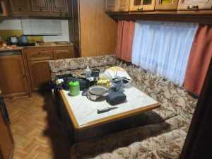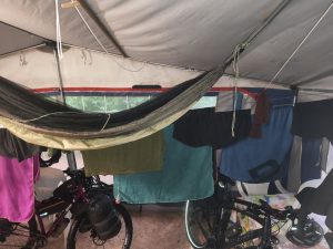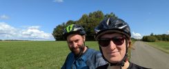 Leider ging dann auch der Regen so richtig los. Es waren ca. 6 km, aber am Ende hat es massiv so massiv gegossen, das 5 min. Gereicht hätten um komplett nass zu sein. Als wir ankamen gab es keine trockene Stelle an den Klamotten oder am Körper. Wir standen wie frisch aus einem See aufgetaucht an der Rezeption und konnten dort eine Nummer anrufen. Es kam eine nette Frau angewuselt. Die hat nur unsere Räder gesehen und direkt gefragt, ob wir einen Wohnwagen mieten wollen. Wir meinten, dass wir eigentlich Zelten wollten, aber fragten was würde der Wagen kosten würde. Die 25 € pro Nacht, für beide zusammen schienen angemessen. Auf der Campingwiese hätten wir auch 16€ gezahlt also müssten wir nicht lange diskutieren und ehrlich gesagt war der Gedanke auch sehr angenehm, trocken zu sitzen und unseren ganzen scheiß mal trocknen zu können. Meine Klamotten waren zwar im drybag und wurden vom Regen nicht nass, aber sie waren immer noch feucht von der Waschmaschine vom Vortag. Dörte fühle sich etwas unwohl in Wohnwagen, besonders weil dieser, inclusive Vorzelt recht abgerockt war. Ich steh auch nicht auf diesen gammel-plastik Flair in Wohnwägen. Im Vorzelt hat es muffig und nach Plastik gestunken. Innen ging es. Also egal. Es hat höllisch gegossen und auch gewittert. Es war also unsere beste Alternative.
