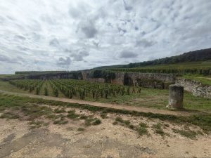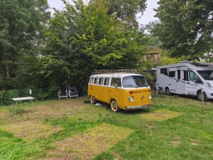 Wir sind die meiste Zeit an Weinreben vorbei gefahren. Das scheint auch ein sehr beliebter Radweg zu sein, da uns so viele Radfahrer wie noch nie begegnet sind. Obwohl wir nicht nur Radwege, sondern teilweise auch Straßen gefahren sind, war super wenig Auto Verkehr. Also mega entspannt. Die Strecke über Land war etwas bergiger als am Kanal, aber noch völlig in Ordnung. Unser Ziel lag dann auf 290 m Höhe. 5 km vorm Campingplatz gab es dann den ersten Umfall der Reise. Ich schreibe das bewusst mit einem „m“. Dörte hat einen Kantstein übersehen und wollte von der Straße auf den gehweg. Das hat ihr dann natürlich den Reifen weggezogen. Irgendwie ist sie aber geistesgegenwärtig vom Fahrrad abgesprungen, so das das Fahrrad volle Pulle auf den Boden gefallen ist und sie etwas perplexed daneben stand. Sie erzählte mir später das sie selber nicht weiß wie das passiert ist. Sie ist also mit einem abgekratzten Lenker und einem blauen Fleck davongekommen.